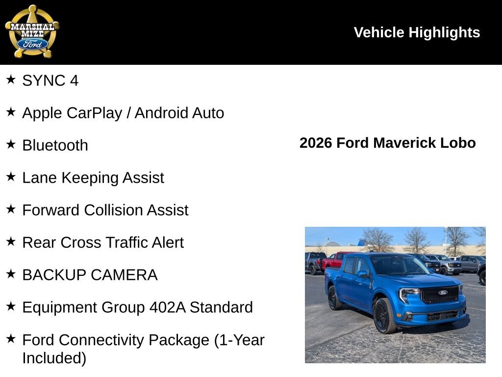2026 Ford Maverick Velocity Blue Price includes: $500 - 2026 Military Recognition Exclusive Cash Reward. Exp. 01/04/2027 $500 - Retail Customer Cash. Exp. 03/31/2026